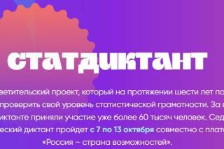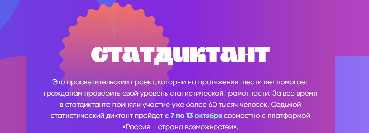 Статистический диктант – всероссийский просветительский проект, приуроченный ко Всемирному дню статистики. Основной целью проекта является повышение уровня статистической грамотности и распространение культуры работы с данными среди различных категорий граждан. По итогам прохождения диктанта участники получили сертификаты.