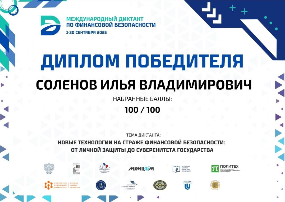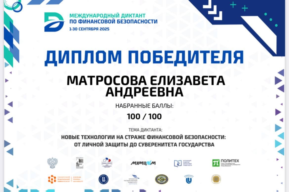 Написав диктант, ребята получили полезную информацию о том, как не стать соучастником финансового преступления, а также о различных формах мошенничества . Соленов Илья и Матросова Елизавета набрали максимальный балл и получили диплом победителя. Поздравляем ребят!!!