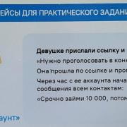 Студенты рассмотрели несколько кейс -моментов, ответили на вопросы и рассказали свои жизненные истории про кибербезопасность. Оказывается, у всех есть горький личный опыт или история о том, как близкие попадались на уловки мошенников.