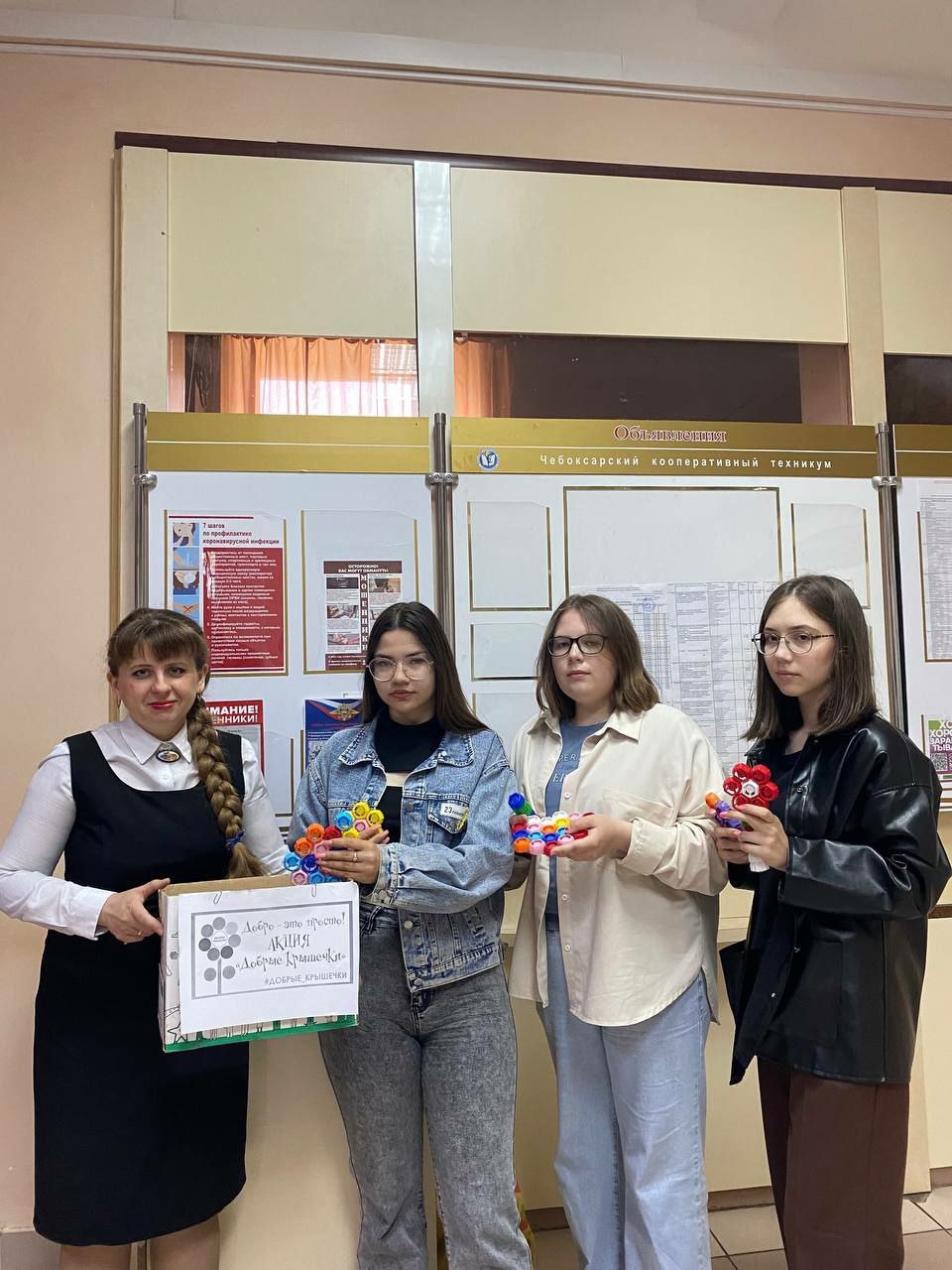 Студенты Чебоксарского кооперативного техникума группы БД-11 под руководством классного руководителя стали кураторами Общероссийского эколого-благотворительного волонтерского проекта "Добрые крышечки". Начинающие экоактивисты из БД-11 установили контейнеры для сбора пластиковых крышек в техникуме на 1-2 этажах и провели разъяснительные беседы среди однокурсников о правилах сортировки.