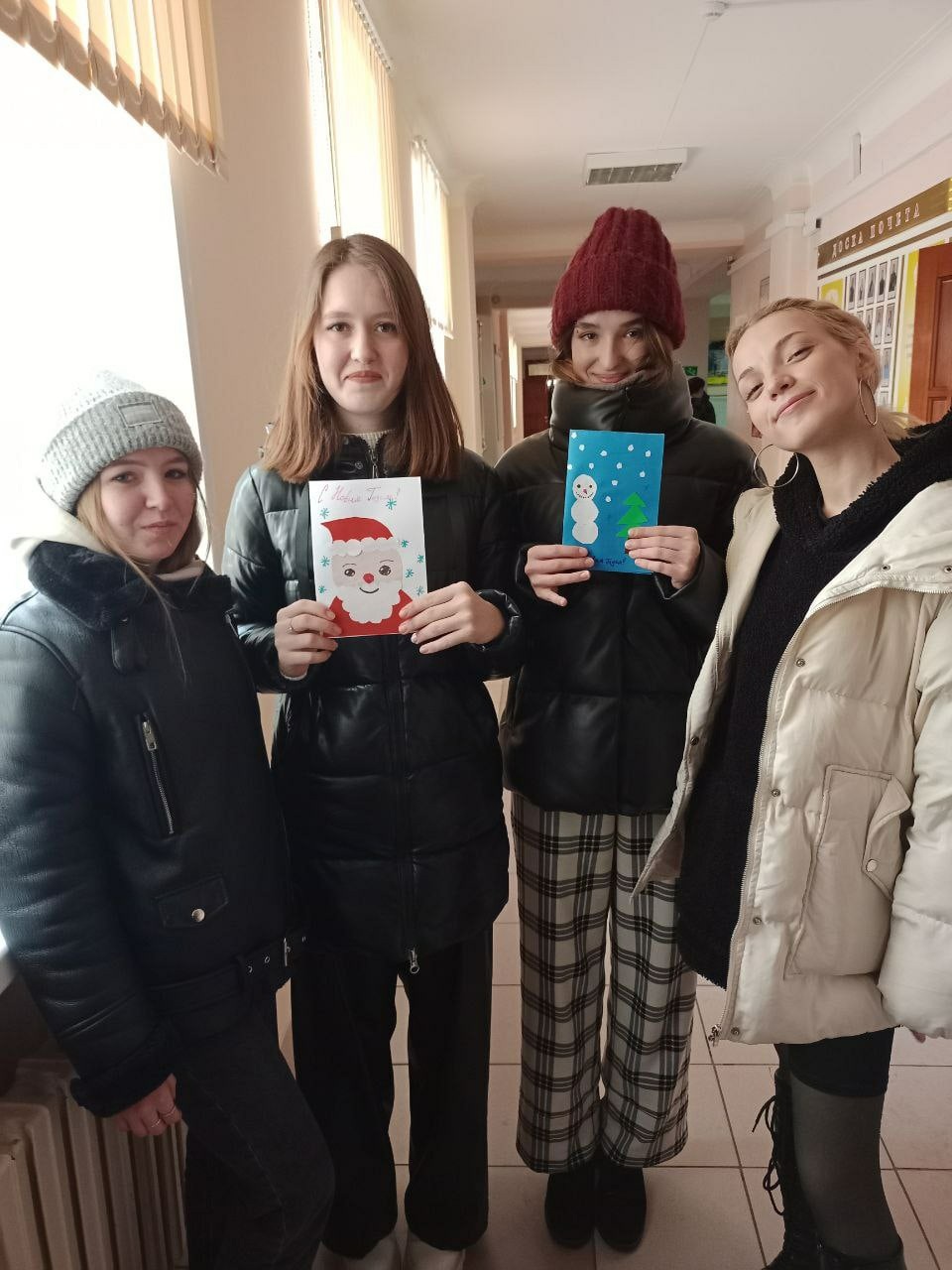 Пусть тем, кто находится вдали от дома, в тяжёлых условиях с честью и достоинством выполняет свой воинский долг — новогодняя открытка, выполненная руками наших студентов, станет своеобразным оберегом. Она будет греть теплом и придаст сил российским солдатам, которые мужественно отстаивают честь и интересы нашей Родины!