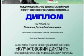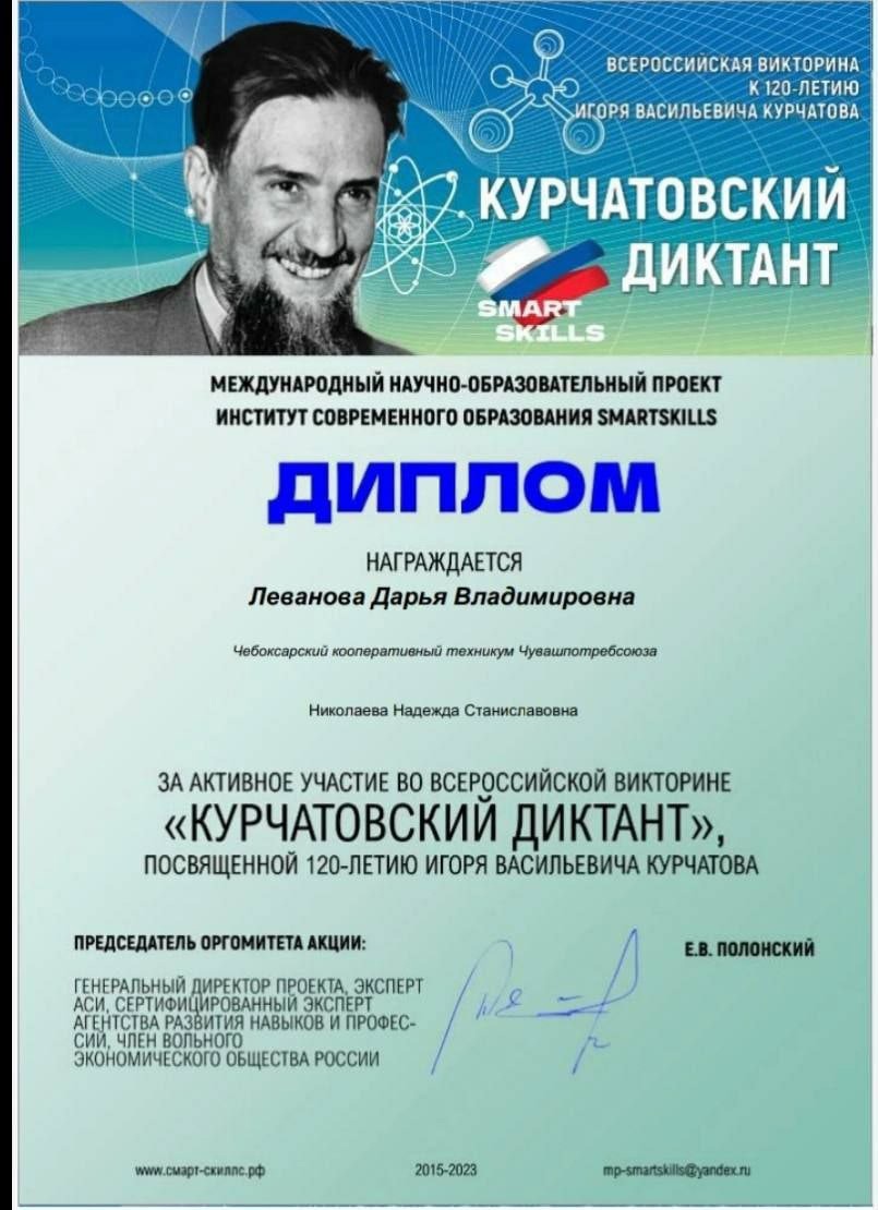 Студенты группы ПСО -12, ПСО -25, ПСА-33, ПСО-35, ПСО -21 Чебоксарского кооперативного техникума приняли участие во всероссийской викторине "Курчатовский диктант" посвящённый 120-летию Игоря Васильевича Курчатова, под руководством преподавателей Николавевой Н.С., Пупиной С.Ф., Потаповой И.В.