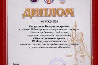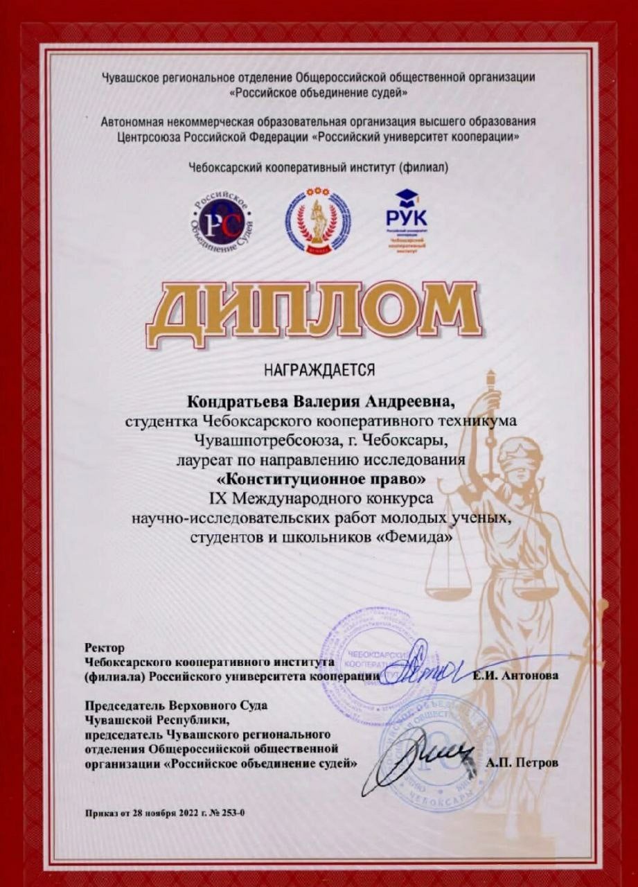 Студентка группы ПСА-34 Кондратьева Валерия - лауреат IX Всероссийского конкурса с международным участием научно-исследовательских работ молодых учёных,студентов и школьников "Фемида-2022" по направлению исследования "Конституционное право".