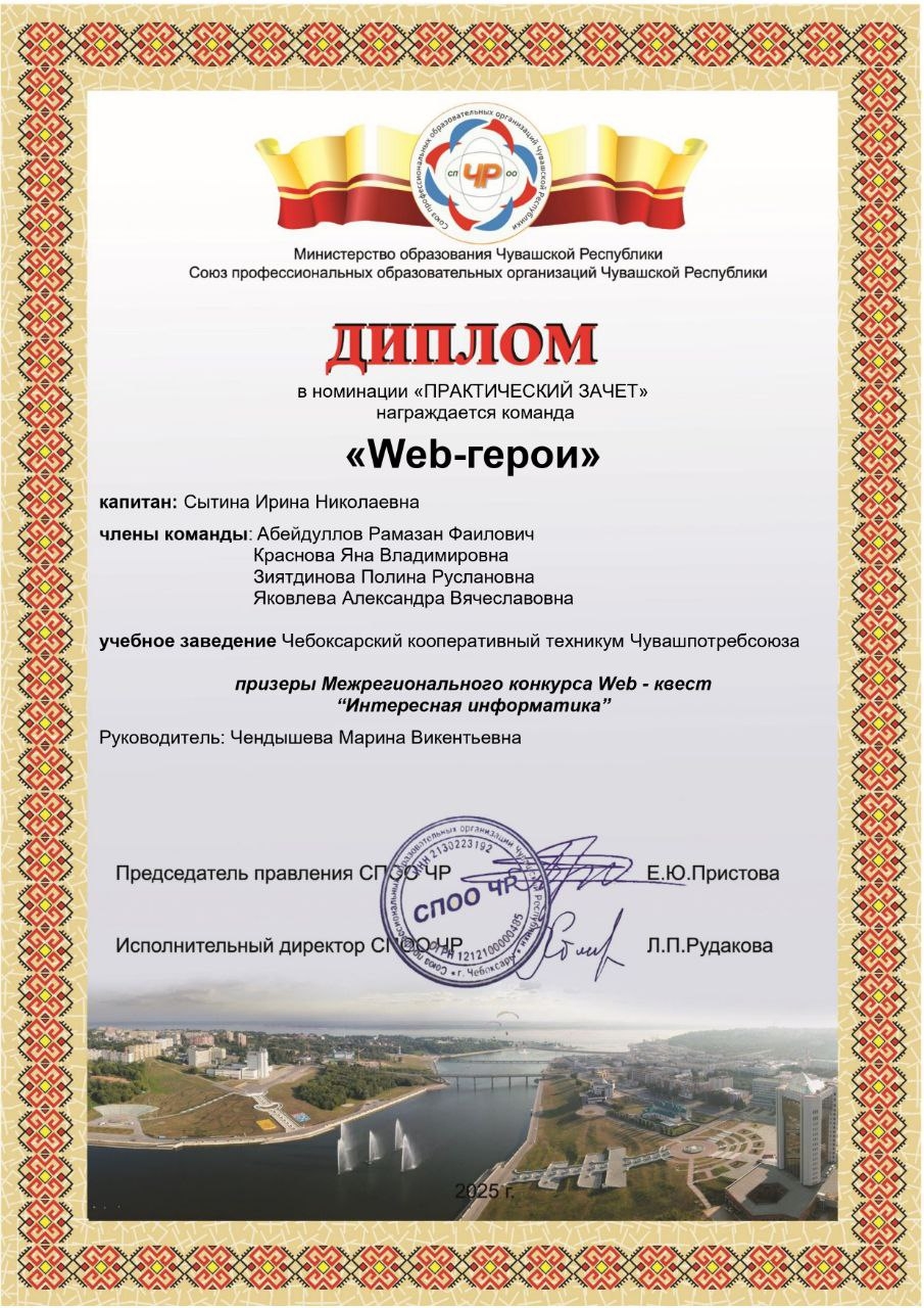 С 10 ноября по 5 декабря 2025 г. студенты группы Веб-11 приняли участие в межрегиональном конкурсе Web–квест «Интересная информатика», который прошел среди обучающихся общеобразовательных организаций, профессиональных образовательных организаций Чувашской Республики и других регионов России.