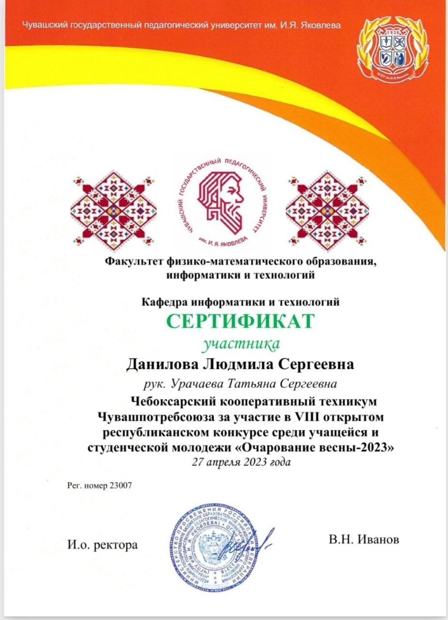 Студентка группы ПСА-15 Данилова Людмила приняла участие в VIII открытом республиканском конкурсе среди учащейся и студенческой молодежи «Очарование весны-2023»,проводимом факультетом физико-математического образования, информатики и технологий ЧГПУ им. И.Я. Яковлева. Участниками конкурса – студенты вузов, обучающиеся организаций среднего профессионального образования и учащиеся общеобразовательных школ,- была представлена 51 работа.Конкурс проводился по следующим номинациям: