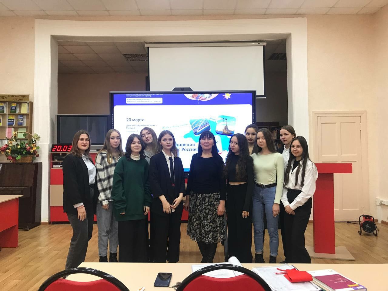 Сегодня в группах ПКД 21, Т 11, Т 21, К 11 состоялся очередной урок из цикла "Разговоры о Важном". Целью занятия было формирование у обучающихся представлений об истории Крыма, как исконно русской территории, понимание причин и исторического значения воссоединения России и Крыма. Занятия проходили в 306 кабинете и беседа сопровождалась показом видеороликов с последующим обсуждением.