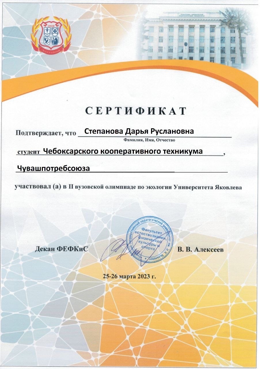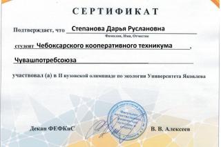 Участниками олимпиады стали 237 учащихся и студентов со всей Чувашии, в том числе и студентка группы ПСО-31 Чебоксарского кооперативного техникума Чувашпотребсоюза Степанова Дарья! Молодец!