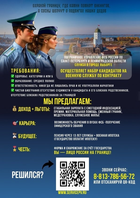 Пограничное Управление ФСБ России по г.Санкт-Петербургу и Ленинградской области (Служба в г. Выборге) осуществляет набор на службу по контракту в пограничных органах ФСБ России