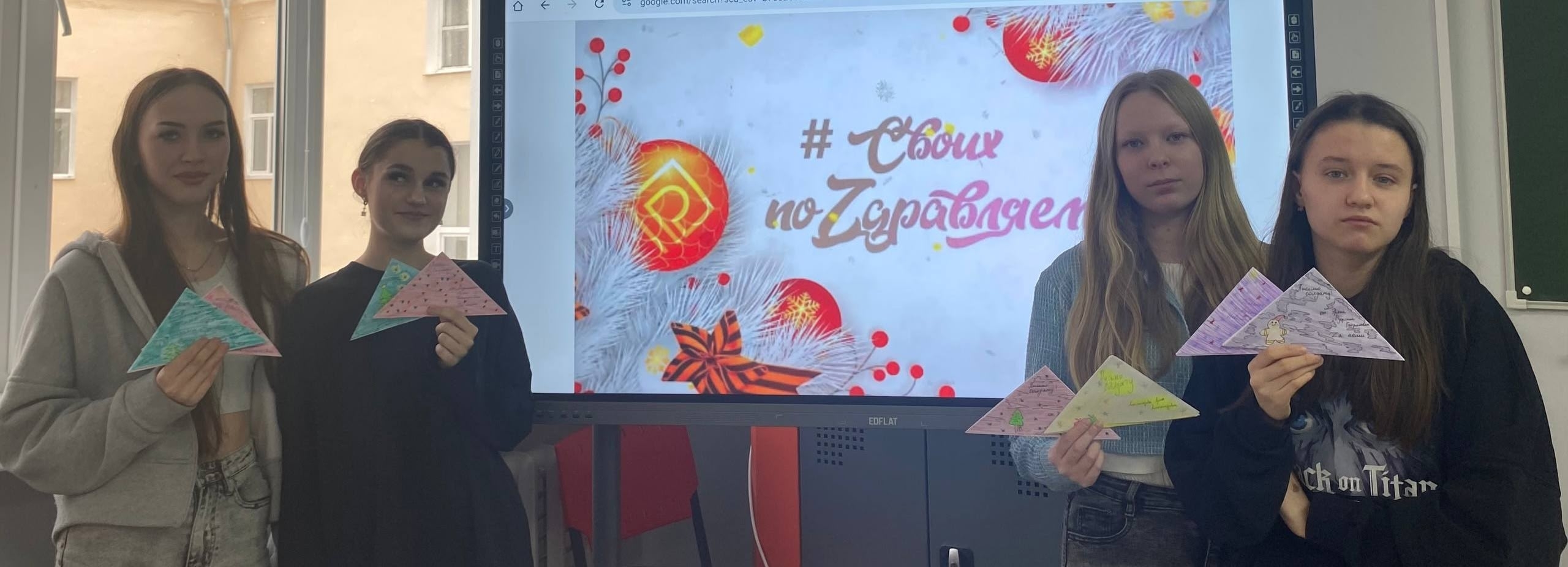 Группа Ю-11, в лице Александровой Арины, Елехиной Дианы, Тарасовой Анны, Терешкиной Арины и Эреш Руфины, приняла участие в поздравлении солдат, участвующих в специальной военной операции, с Новым годом. Мы сделали небольшие, но очень символичные подарки — конверты-треугольники, которые солдатам очень напоминают фронтовые письма времен Великой Отечественной войны. В каждом конверте было тёплое пожелание и слова благодарности за их мужество и самоотверженность.