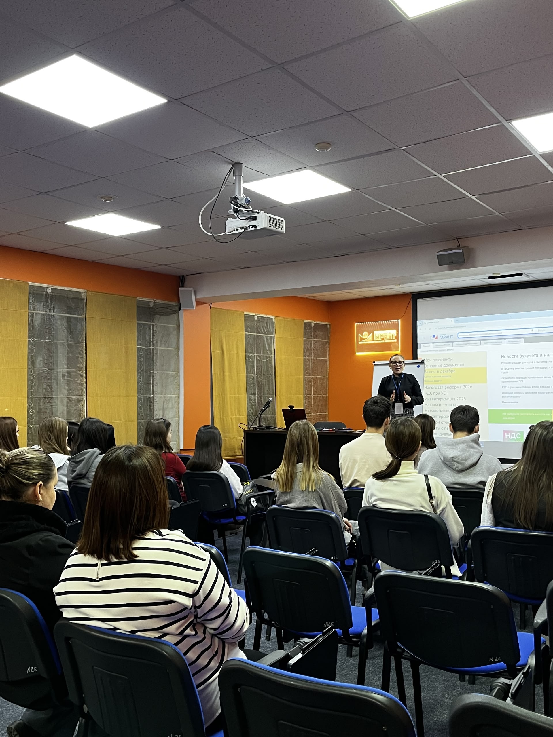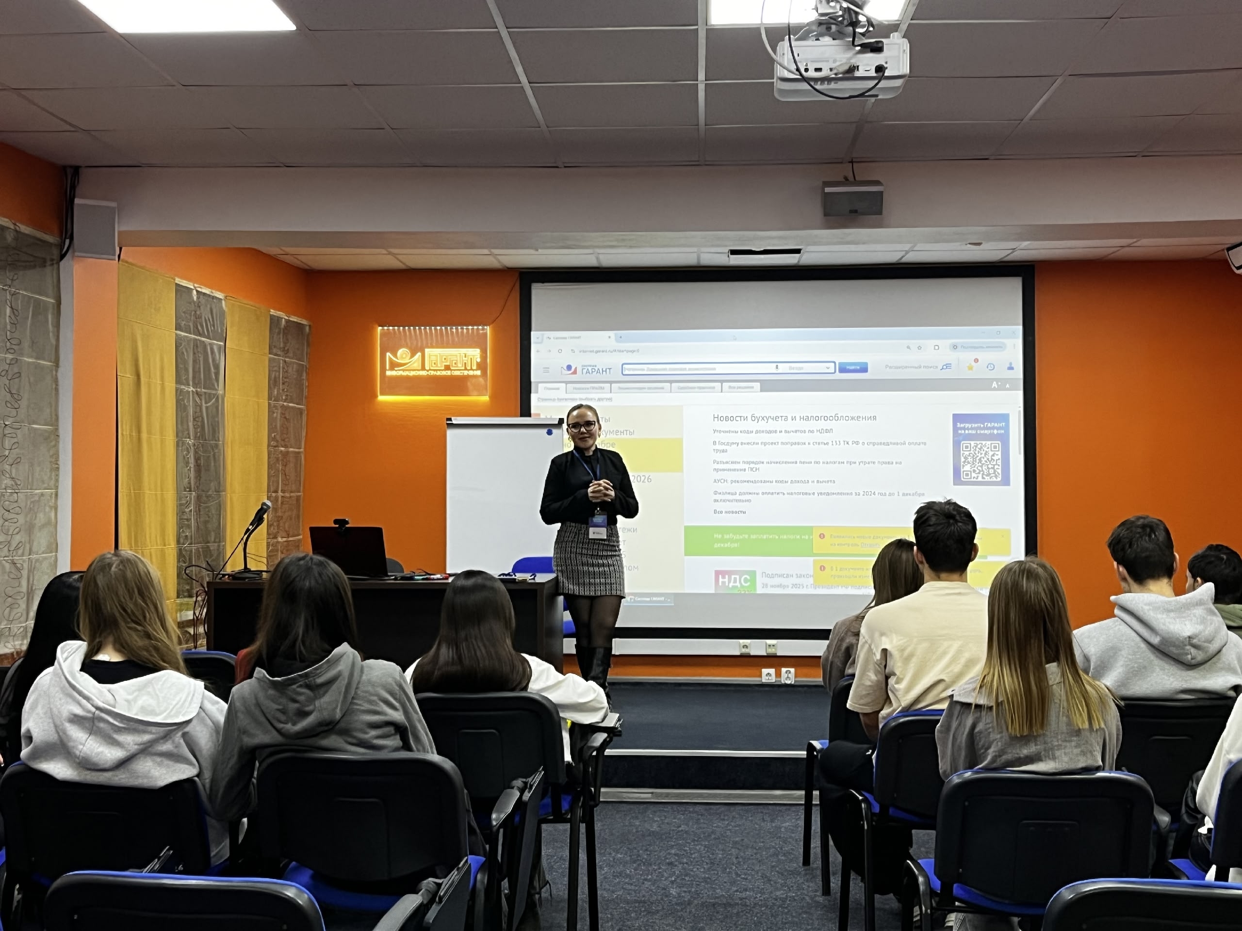 Студентам напомнили об основном функционале платформы: она помогает автоматизировать рутинные процессы и облегчить работу юристам, бухгалтерам и HR-специалистам. Уточнили, что система упрощает соблюдение законодательства, актуализируя последние данные. Продемонстрировали интерфейс программы, его удобство и интуитивную навигацию, а также инструменты для аналитики и отчетности.
