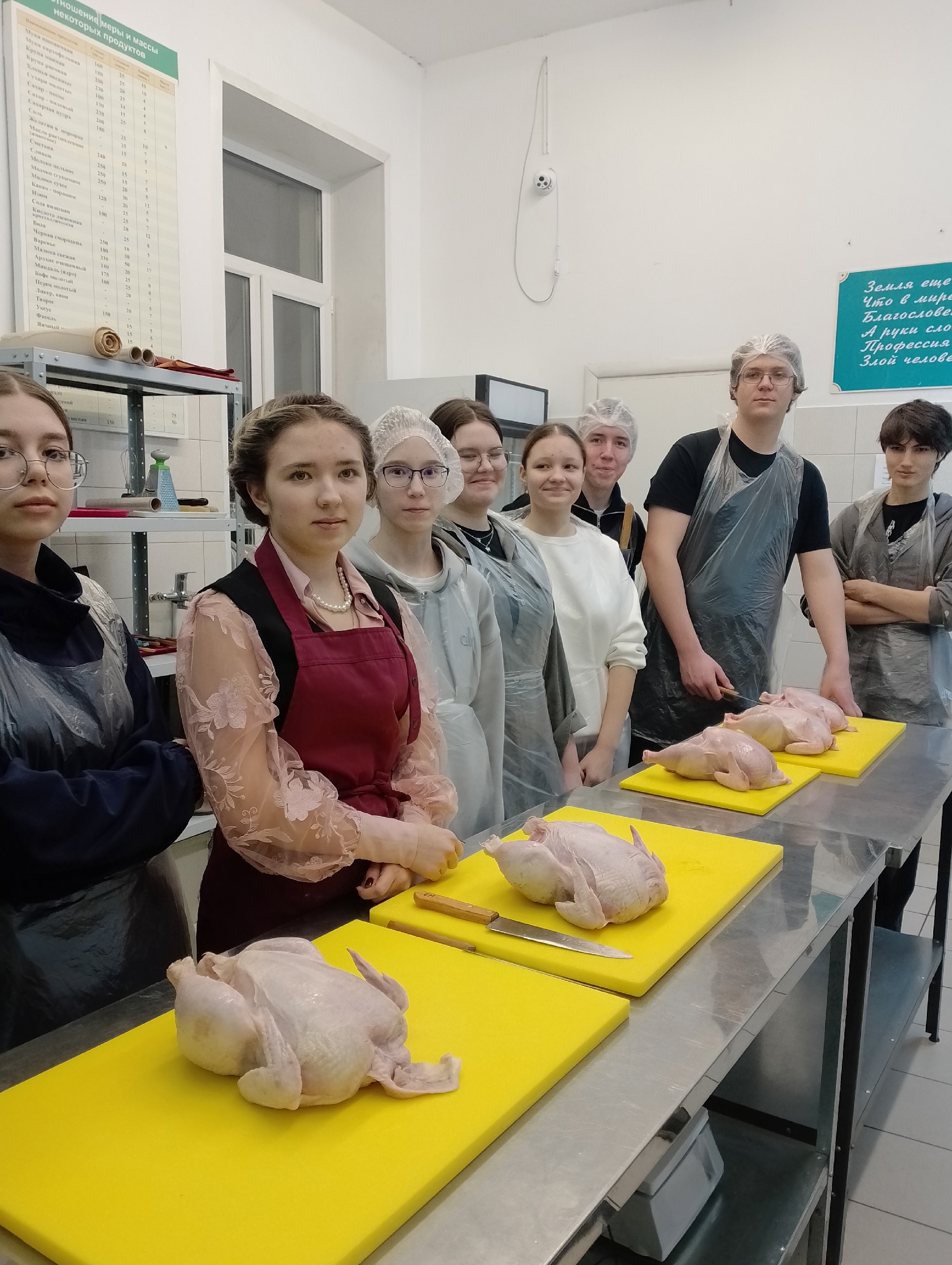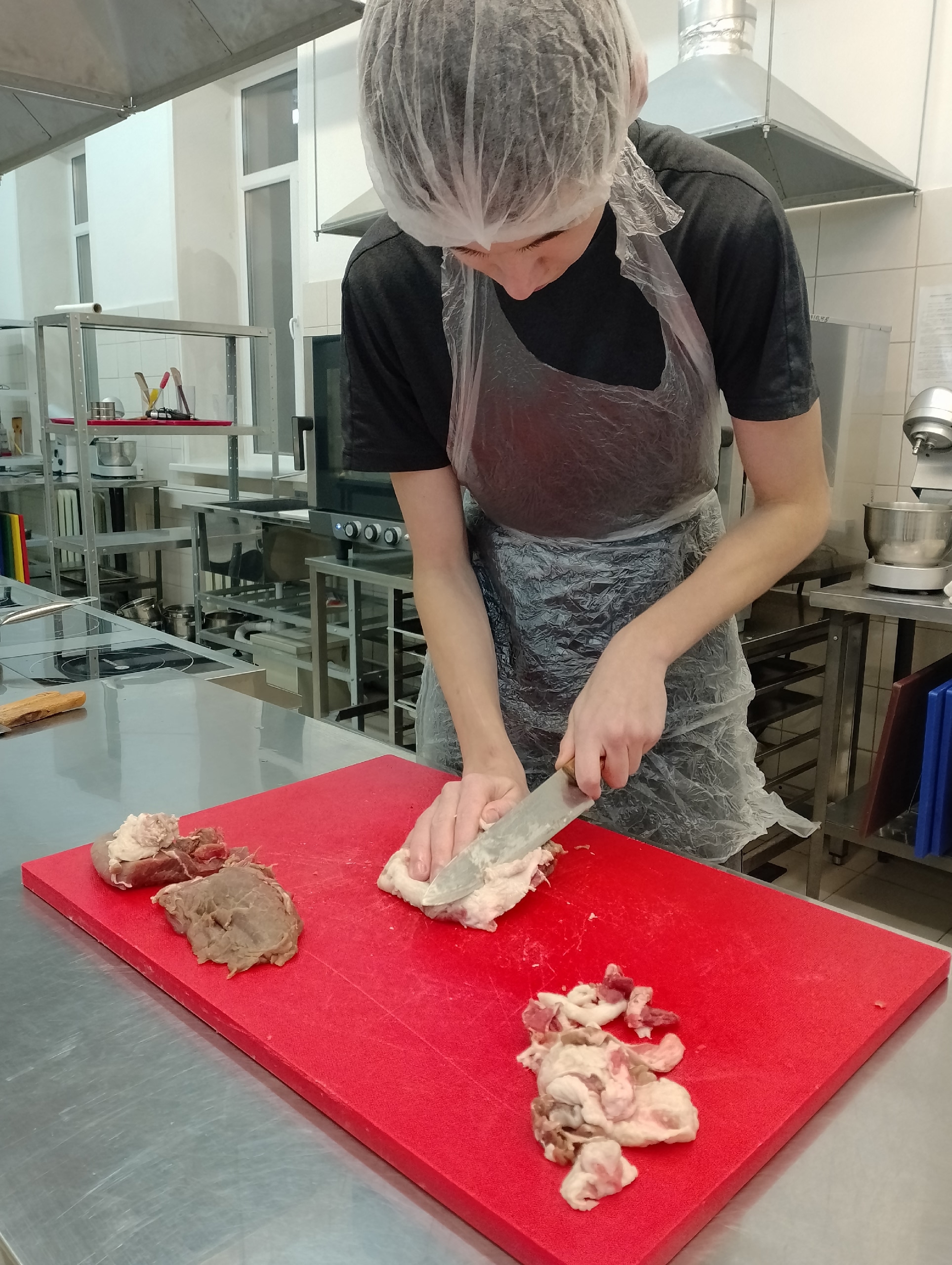 В ходе занятий будущие специалисты по профессии повар отрабатывали навыки по организации рабочих мест, подбора оборудования, инвентаря при приготовлении полуфабрикатов из мяса и птицы.