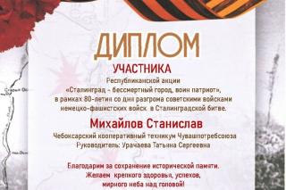 Михайлов Станислав( ПСА-15) и Кваскова Дарья (ПСО-31), приняли участие в республиканской патриотической акции "Сталинград - бессмертный город, воин, патриот",организатором которой выступил ДК "АРТ Ровесник" . Студенты подготовили видео с прочтением отрывков из художественных произведений о Сталинградской битве и были награждены дипломами! Данный конкурс направлен на патриотическое воспитание молодёжи и сохранение исторической памяти! Благодарим ребят за участие!!!!