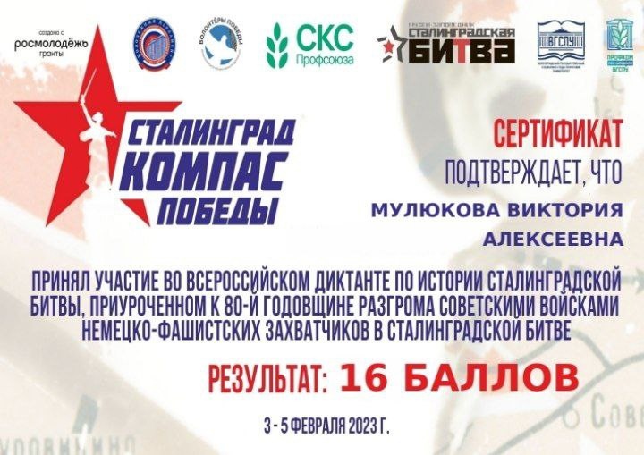 В связи с этим со 2 по 5 февраля проходит Всероссийский диктант по истории Сталинградской битвы "Сталинград - компас победы".