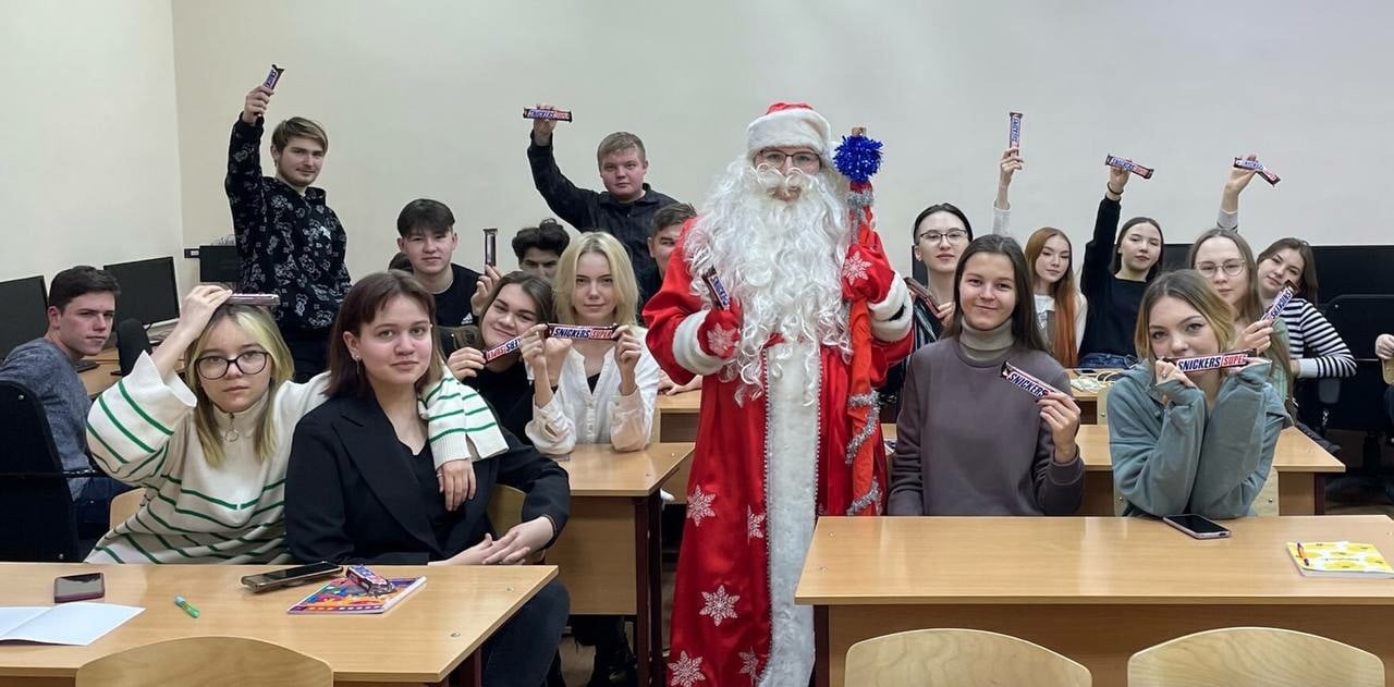 К студентам в гости пришел Дедушка Мороз, студенты активно его встретили стихотворениями и песнями. Дед Мороз вручил каждому сладкий подарочек, пожелал счастья, здоровья и летнюю сессию сдать «без хвостов»!