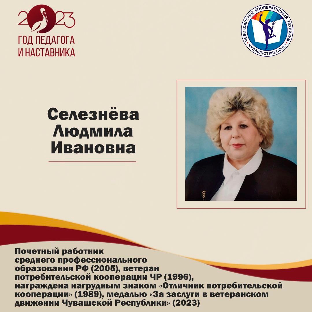 Селезнева Людмила Ивановна – тот человек, который с уверенностью может сказать: «Жизнь моя - кооперация». 47 лет работы в системе потребительской кооперации Чувашии говорят о ее преданности любимому делу.
