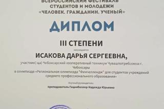 Студенческое научное общество Чебоксарского кооперативного техникума Чувашпотребсоюза принимало участие во Всероссийском фестивале студентов и молодежи"Человек.Гражданин.Ученый -2022." В секции "Финансы, денежное обращение и кредит ( для студентов СПО) научная работа на тему "Условия и факторы формирования и развития предпринимательской деятельности Российской Федерации" Ниловой А. Ю. , студентки 2 курса группы Б-21 завоевала - диплом 1 степени ; научная работа на тему "Денежная реформа Ф.Ю. Витте и ее влияние на социально-экономическую жизнь России на рубеже IX-XX вв." - Санковой А.Е., студентки 2 курса группы Ф-21 завоевала - диплом 3 степени. Активно студенты 1-3 курсов Чебоксарского кооперативного техникума Чувашпотребсоюза приняли участив в олимпиаде "Региональная олимпиада "Финчеллендж" для студентов учреждений среднего профессионального образования - Исакова Дарья, гр. Ф-21 -диплом 2 степени. Поздравляем с победой!!! Так держать! Желаем успехов в дальнейшей студенческой научно-исследовательской деятельности !
